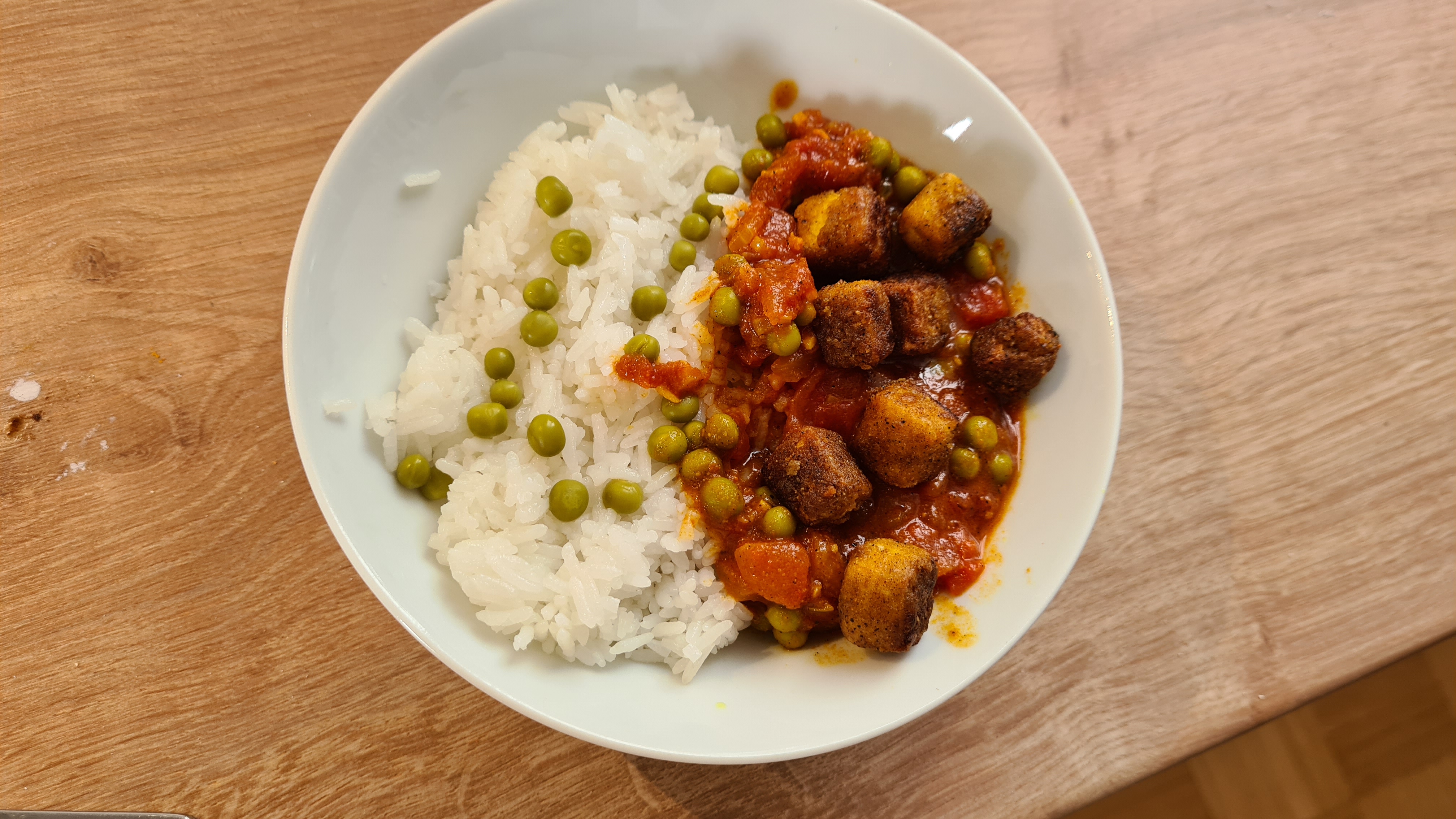 Die Zwiebel würfeln und den Knoblauch hacken. Etwas Pflanzenöl in einer Pfanne erhitzen und beides glasig anschwitzen. Garam Masala, Ingwer, Kurkuma und Cayennepfeffer hinzugeben und kurz mit anschwitzen. Die stückigen Tomaten und die Kokosmilch hinzugeben und alles zusammen 8 Minuten köcheln lassen. Die Erbsen hinzufügen und die Soße weitere 5 Minuten köcheln lassen.