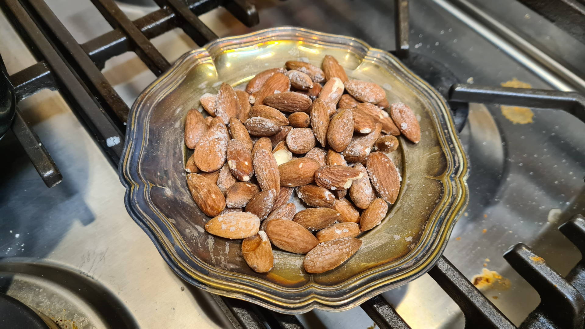 Anschließend mit 1-2 Esslöffeln Salz mischen. Das richtet sich danach wie salzig sie sein sollen und wie scharf das Salz ist. Meersalz ist milder, Steinsalz ist schärfer. Die Mandeln so oft wenden, bis sie rundum mit Salz bedeckt sind.